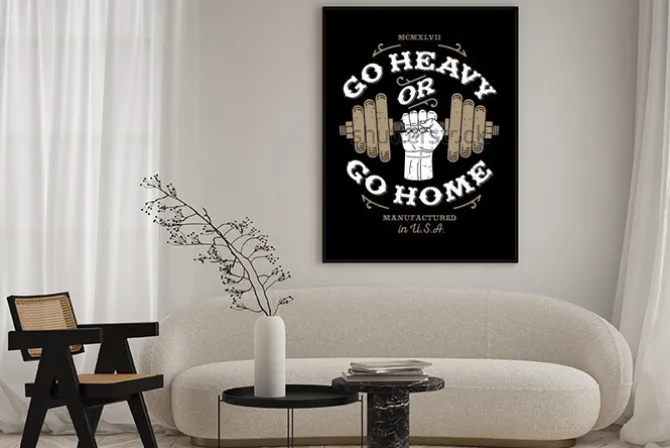 Plakat: Motyw siłowni i kulturystyki z motywacyjnym napisem