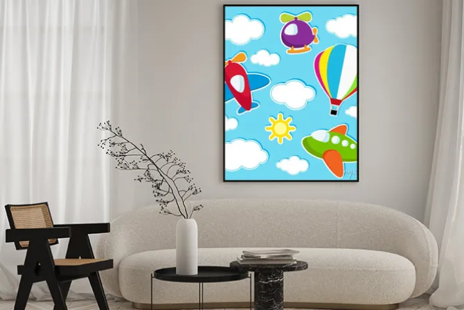 samolot, słońce, samoloty, niebo, krajobraz, rysunek, ilustracje, pokój dziecięcy, ładny