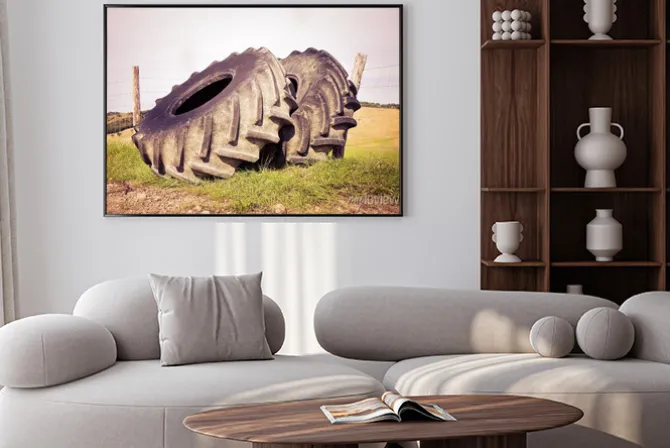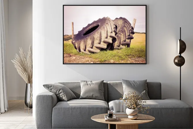 Plakat: Para opon dużym ciągnikiem zdemontowane i pozostawione w języku
