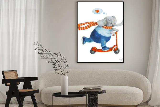 Plakat: Słoń na hulajnodze z serca. miłość. akwarela i gwasz ilustracja