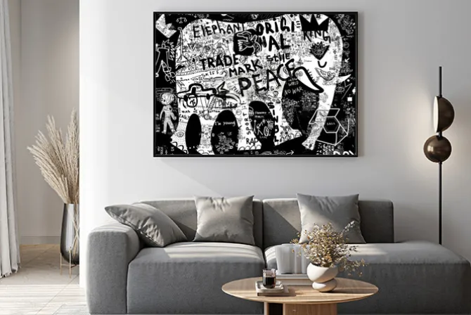 Plakat: Sylwetka słonia, który zawiera wiele symboli