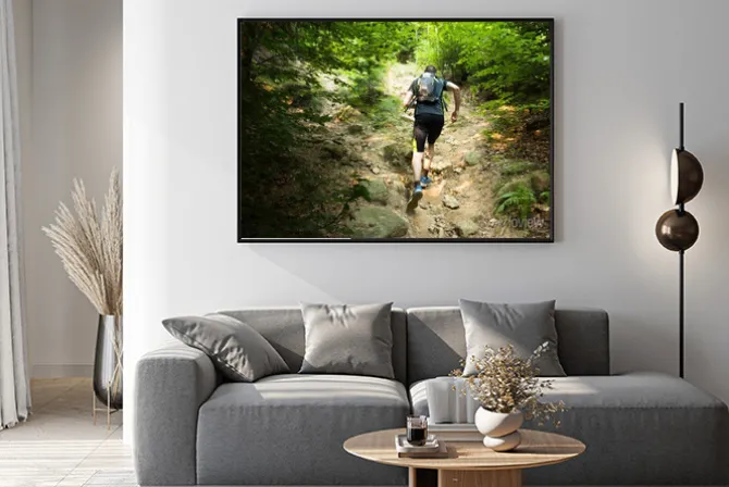 Plakat: Trailrunner z plecakiem uruchomiony po stromym wzgórzu