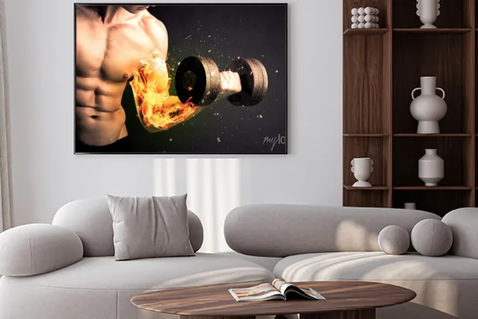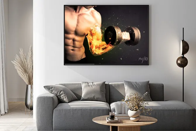 Plakat: Umięśniony mężczyzna dźwigający sztangę