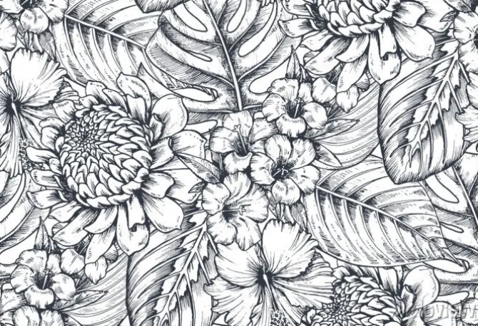 Czarno biały wzór w egzotyczne rośliny.