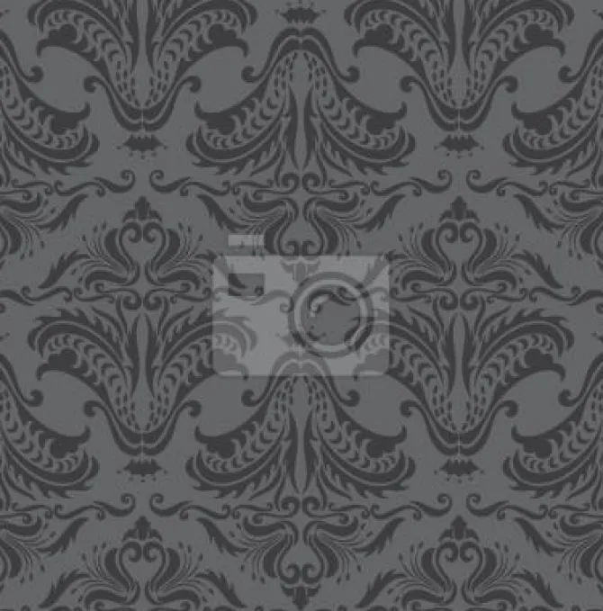 Czarny dekoracyjny ornament w stylu barokowym na szarym tle.