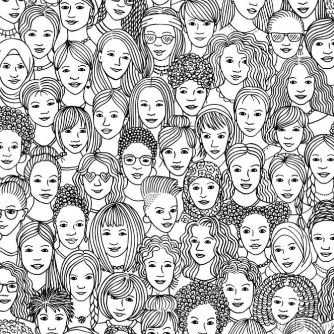 Kobiety – ręka rysujący bezszwowy wzór tłum różne kobiety od różnorodnego pochodzenia etnicznego w czarny i biały.