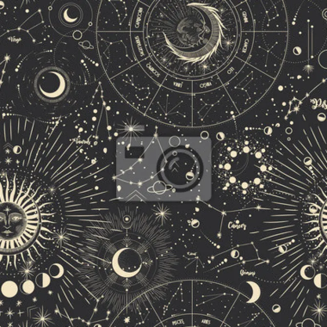 Kosmiczne symbole i fazy księżyca na ciemnym tle.