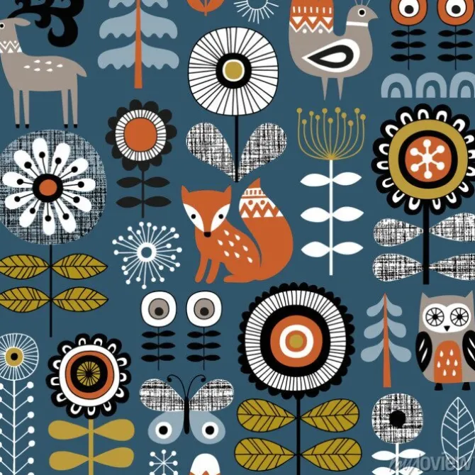 Ręcznie rysowane bezszwowe wektor wzór na ciemnym niebieskim tle. Skandynawski rysunek kwiatów, zwierząt leśnych i tradycyjnych motywów. Idealny do tkanin, tapet lub papieru do pakowania..