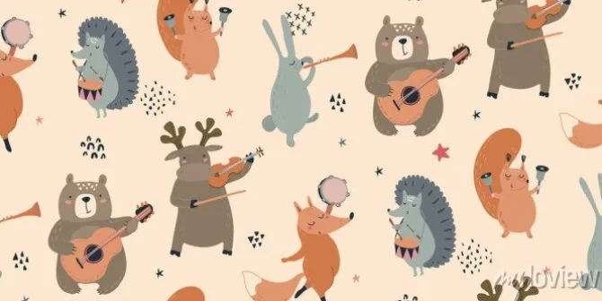 lis, kolory, las, styl skandynawski, instrumenty, wiewiórka, tekstura, królik, muzyka