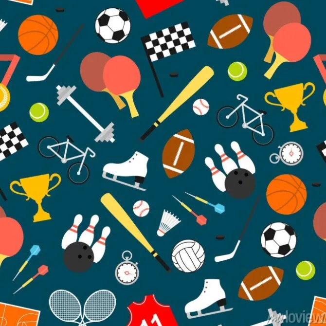 Sport szwu z piłki nożnej, tenisa i koszykówkę, baseball, rugby, gry w kręgle, hokej Puck i rakieta, medal, flagi wyścigowe i trofeum, stoper, hantle, rower, łyżwy.