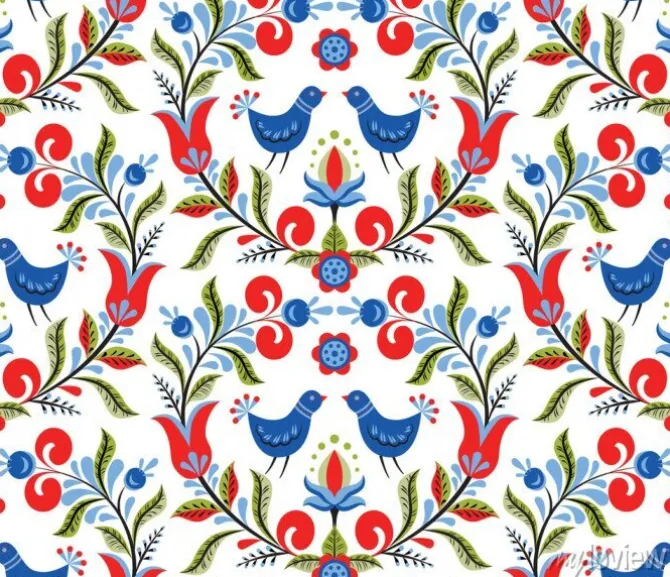 europa, styl skandynawski, folklor, ptaki, kwiaty, niebieski, liść, zielony, biały