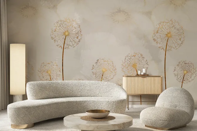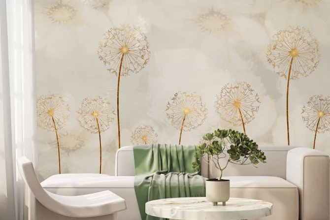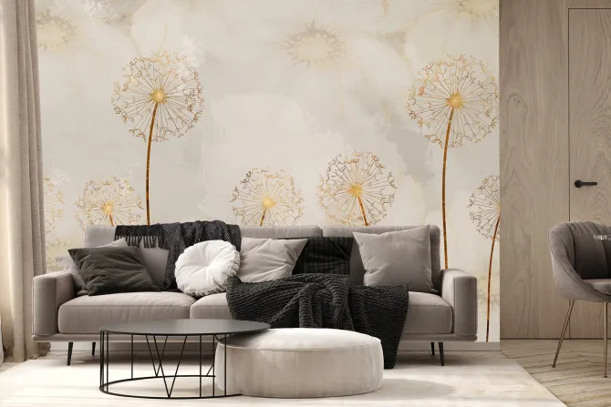 Abstrakcyjne dmuchawce w złotawym kolorze na tle delikatnych malowanych kwiatów.