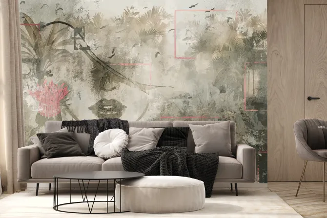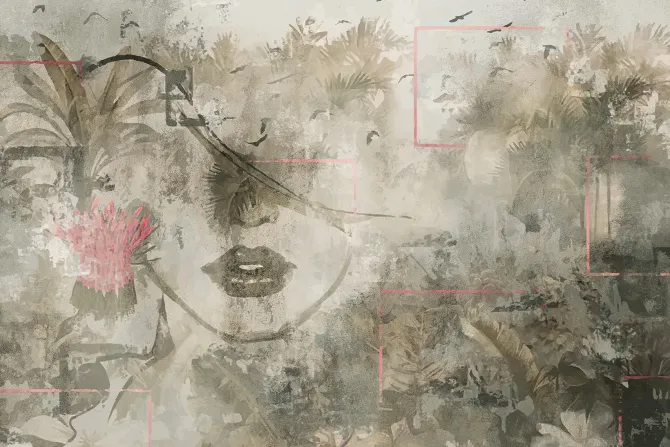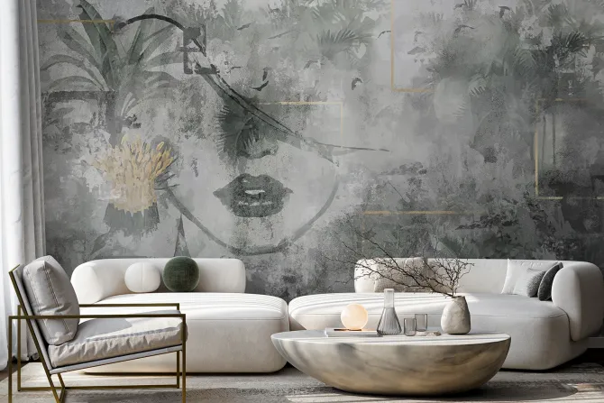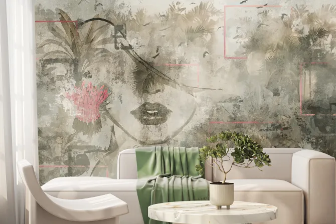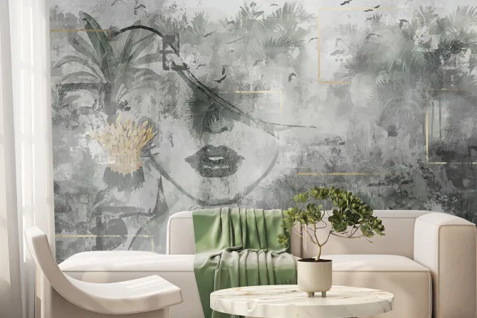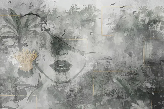 Abstrakcyjny portret kobiety z roślinami tropikalnymi na tle betonu.