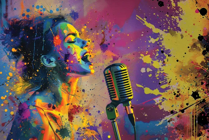 Akwarelowa abstrakcja śpiewającej kobiety.