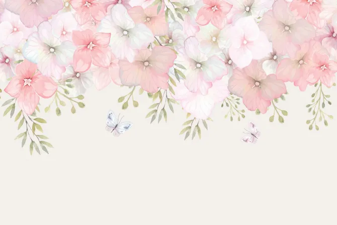 Akwarelowe kwiaty i motyle w pastelowej kompozycji.