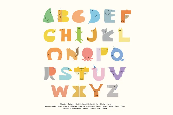 Alfabet w kształcie zwierzątek dziecięcy wzór.
