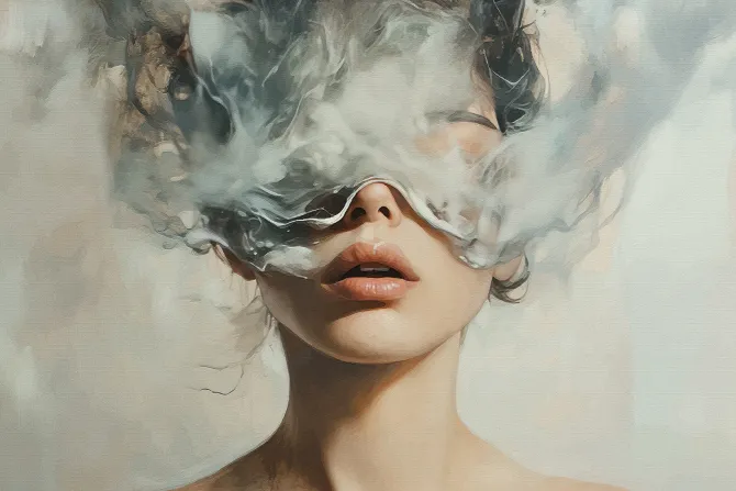 Artystyczny portret z wizerunkiem kobiety i chmurą dymu.