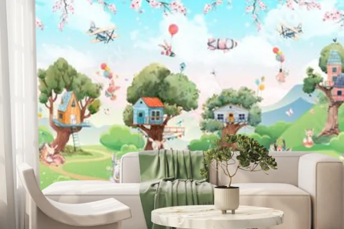 Fototapeta: Bajkowa kraina ze zwierzątkami i domkami na drzewach