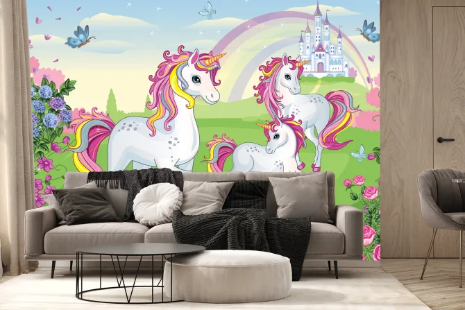 Bajkowe jednorożce wśród kwiatów z zamkiem i tęczą.