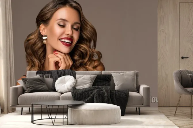 Beautiful smiling woman with long wavy hair . Girl curly hairstyle and red manicure nails . Beauty ,makeup and cosmetics . Earring jewelry.