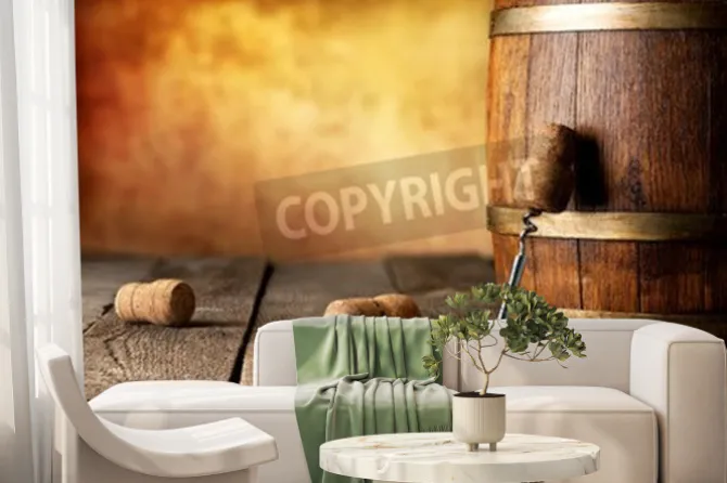 Fototapeta: Beczka wina i korkociąg na drewnianym stole