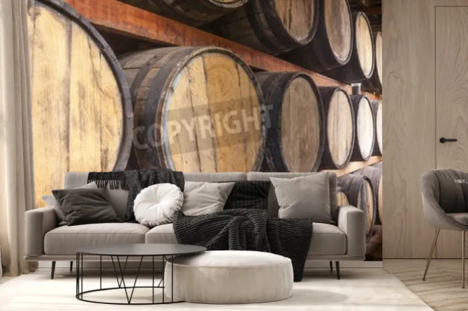 Fototapeta: Beczki dębowe ułożone do przechowywania napojów alkoholowych,