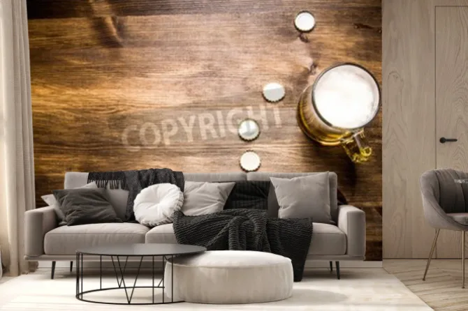 Fototapeta: Beera style- butelka, piwo w szkle i obejmuje na drewnianym stole.