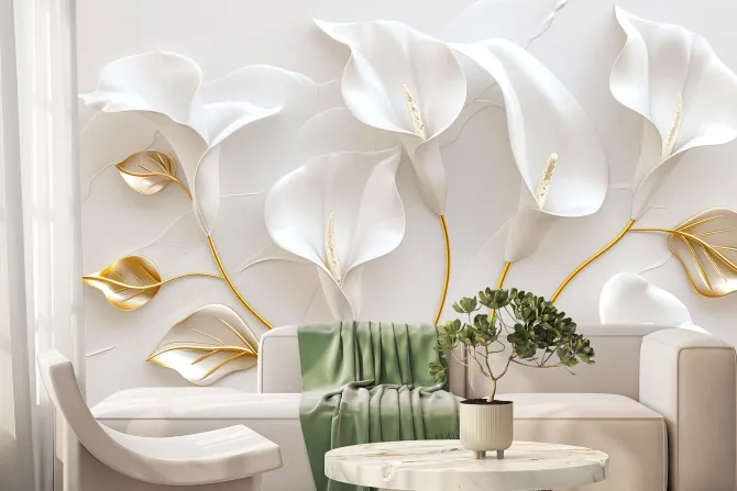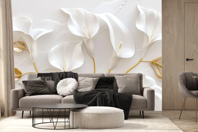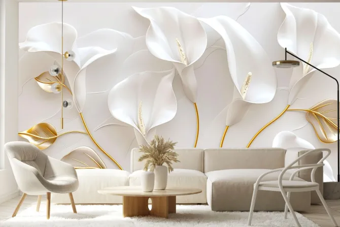 Fototapeta: Białe kalie kwiaty i złote liście w stylu glamour
