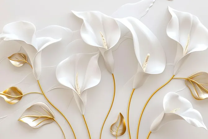 Białe kalie kwiaty i złote liście w stylu glamour.
