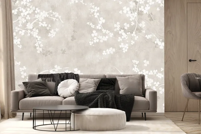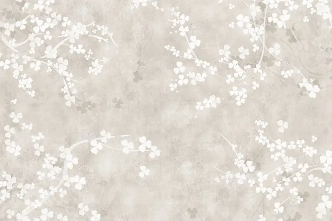 Białe kwiaty z gałązkami na beżowym tle.