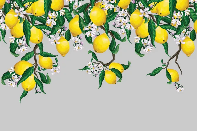 Fototapeta: Cytryny otoczone kwiatami i liśćmi