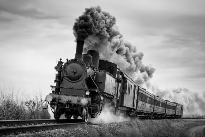 Fototapeta: Czarno-białe zdjęcie jadącego pociągu parowego