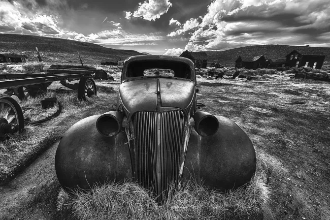 Fototapeta: Czarno-białe zdjęcie wraku samochodu