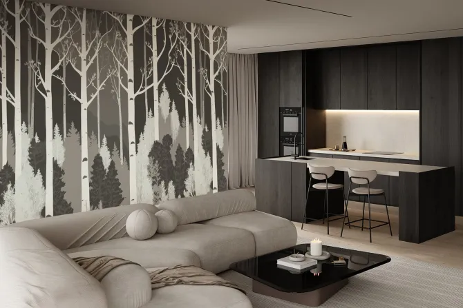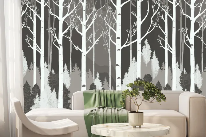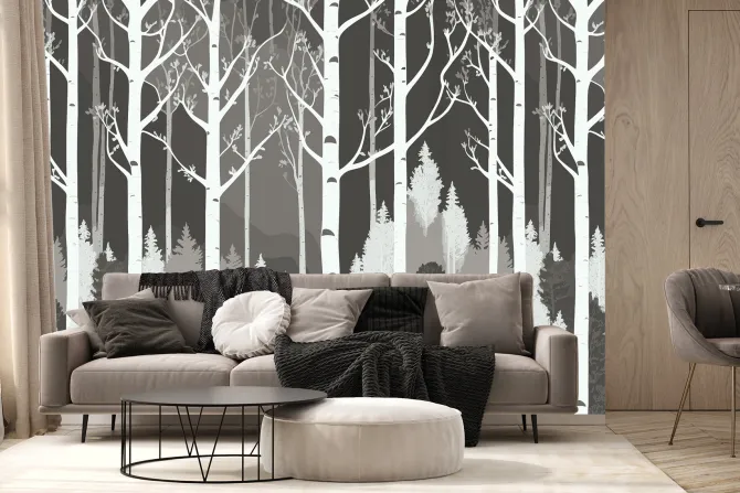 Fototapeta: Czarno biały las z brzozami