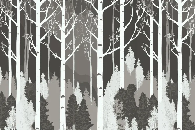 Czarno biały las z brzozami.