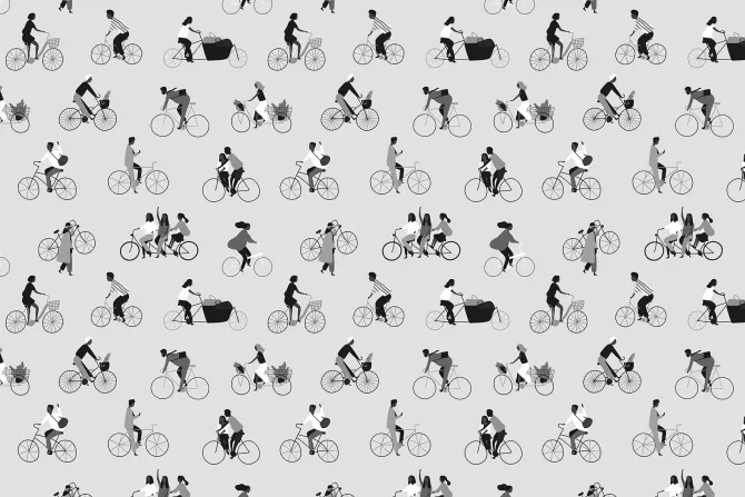 Czarno-biały wzór z ludźmi na rowerach.