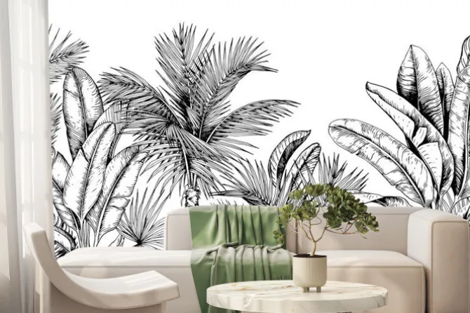 Czarno biały wzór z palmami i liśćmi bananowca.