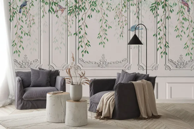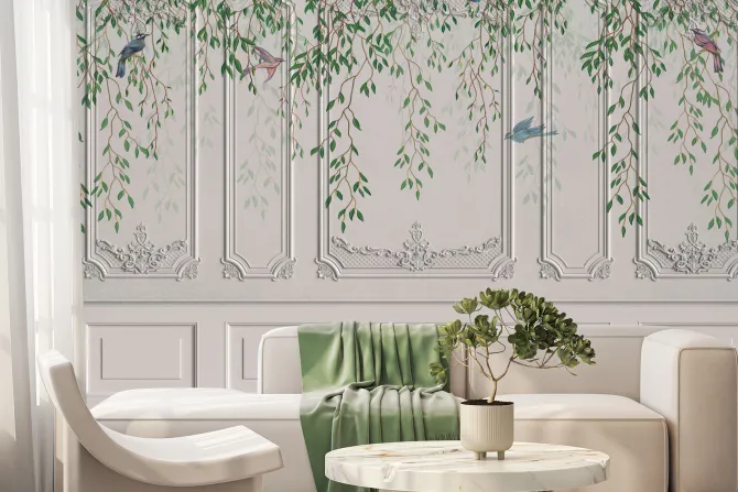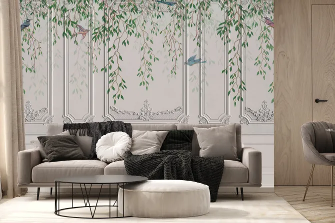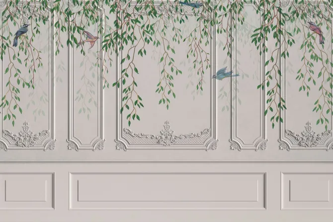 Fototapeta: Dekoracyjna ściana z ptakami i roślinami