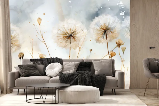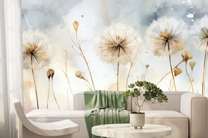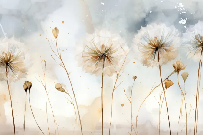 Delikatne dmuchawce na akwarelowym tle subtelny botaniczny motyw.