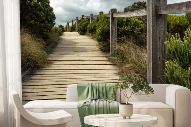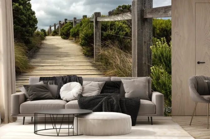 Drewniany chodnik wzdłuż ogrodzenia z zielona roślinność rośnie po obu stronach przy zachmurzonym niebie. Ten znajduje się gdzieś wzdłuż Great Ocean Road w Australii..