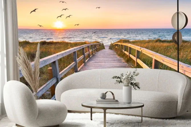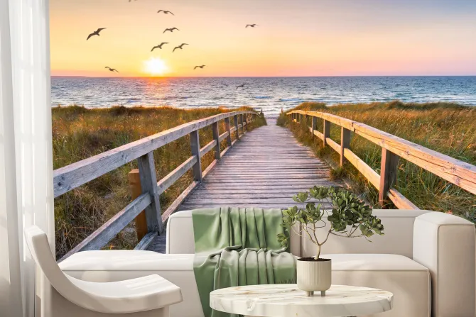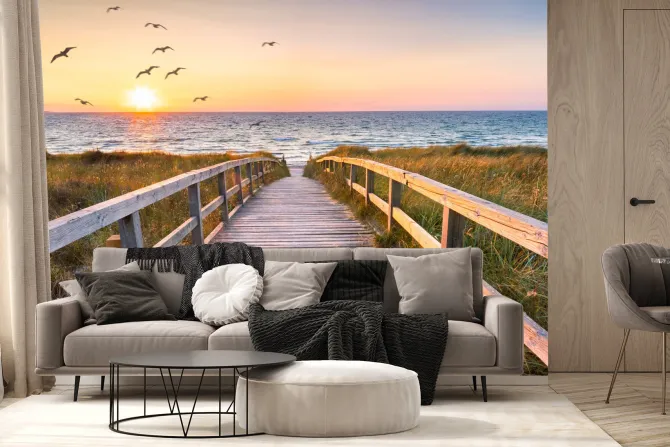 Fototapeta: Drewniany most i ptaki na tle zachodu słońca nad morzem