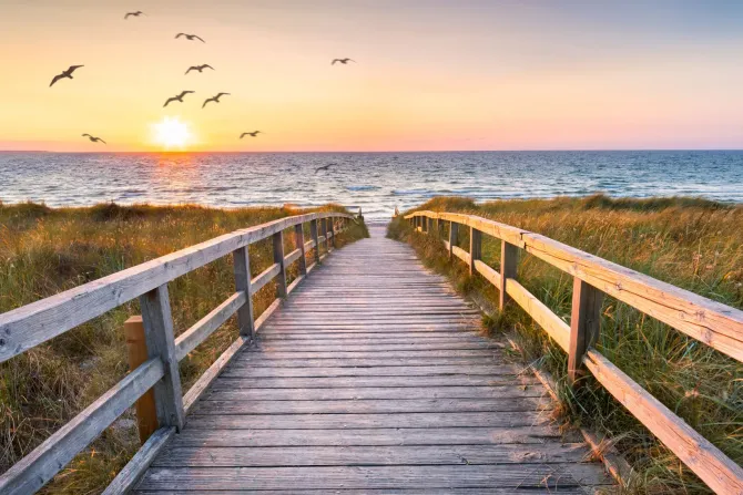 Drewniany most i ptaki na tle zachodu słońca nad morzem.