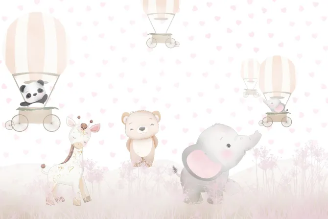 Dziecięcy wzór z balonami różowymi kwiatami i zwierzątkami.