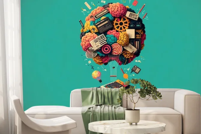 Generative AI illustration of conceptual art of some books on a turquoise green background from which various objects come out forming a globe representing the various human and scientific knowledge.