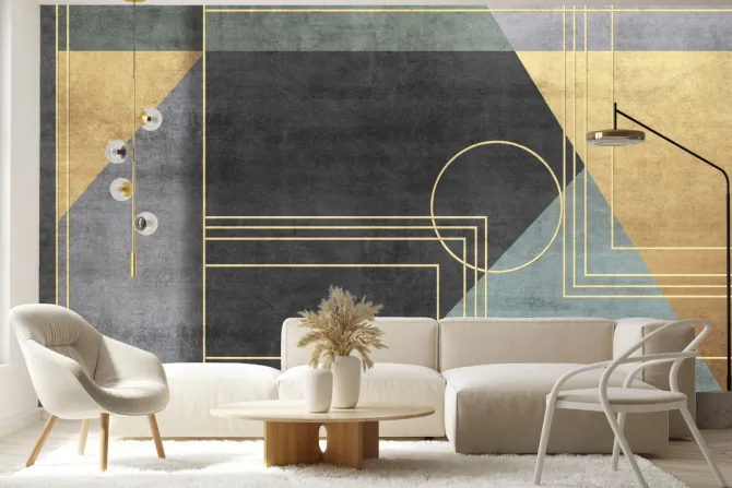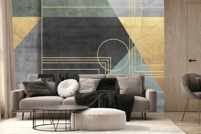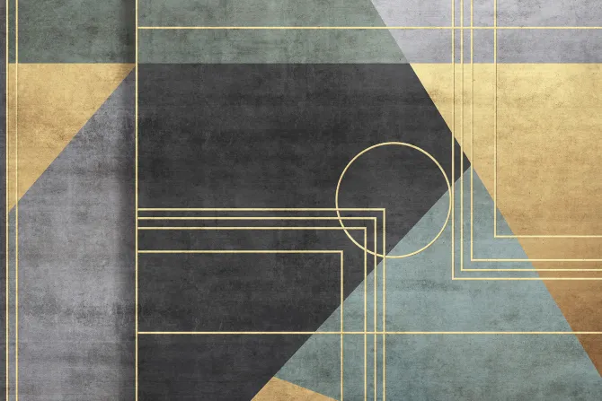 Geometryczne figury w kolorach czerni zieleni i złota.