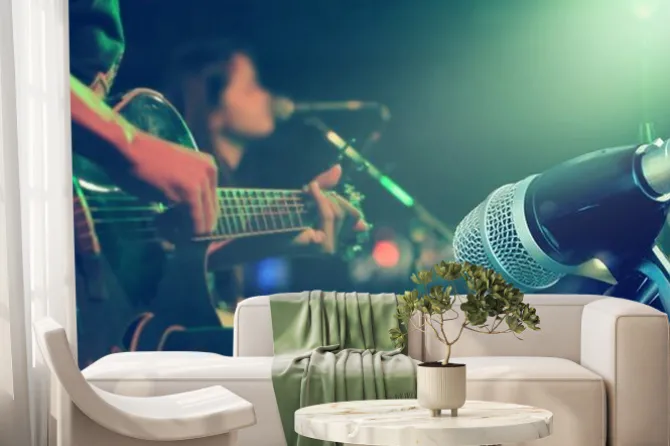 Fototapeta: Gitarzysta na scenie z mikrofonem na tle, miękki i rozmycia pojęcia