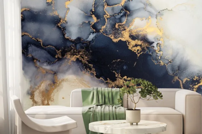 Fototapeta: Granatowo-biały marmur ze złotawymi zdobieniami