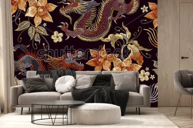 Fototapeta: Hafty smoki i kwiaty wzór. klasyczny haft azjatycki smok i piękne