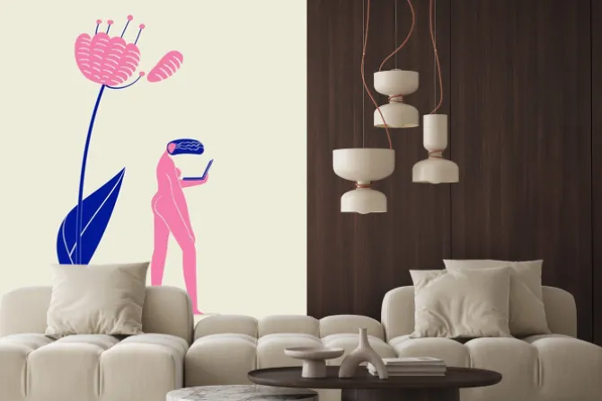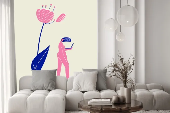 Fototapeta: Ilustracja nagiej dziewczyny z notebookiem pod kwiatem, osobą,
