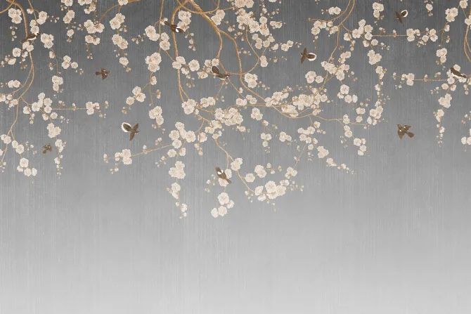 Ilustracja z gałęziami ptakami i kwitnącymi pąkami.